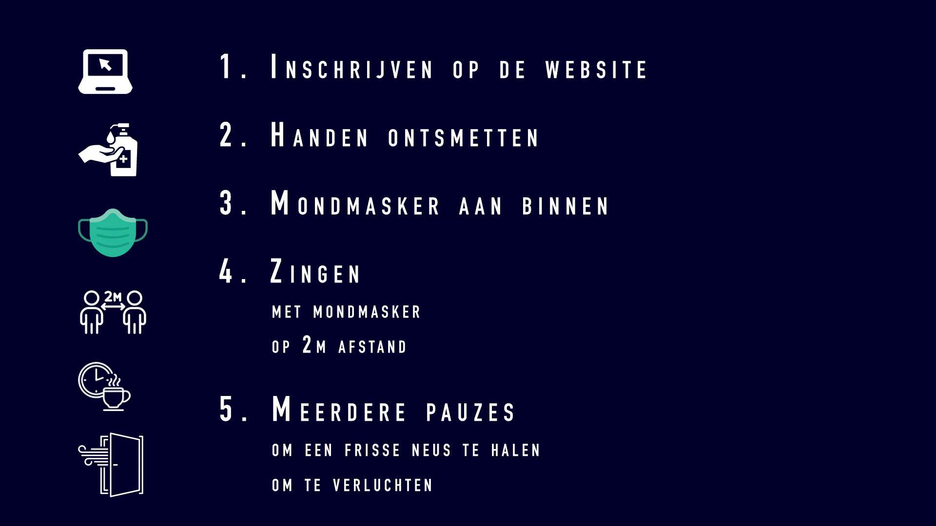 Dit jaar wordt er geen zoals vorige jaren, maar niettemin staan wij klaar voor weer een zalig koorjaar! We nemen dan ook enkele maatregelen om de repetities vlot en veilig te laten verlopen.